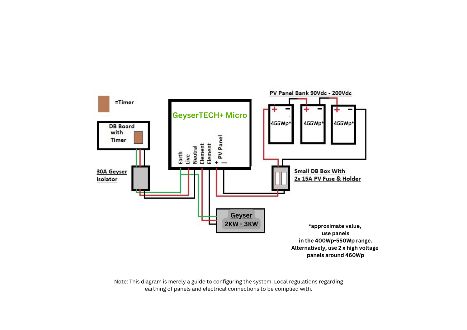 Configuring and installing the system is straightforward. Connect to your existing geyser. No additional plumbing required. This diagram is merely a guide to configuring the system. Local regulations regarding earthing of solar panels and electrical connections should be complied with.