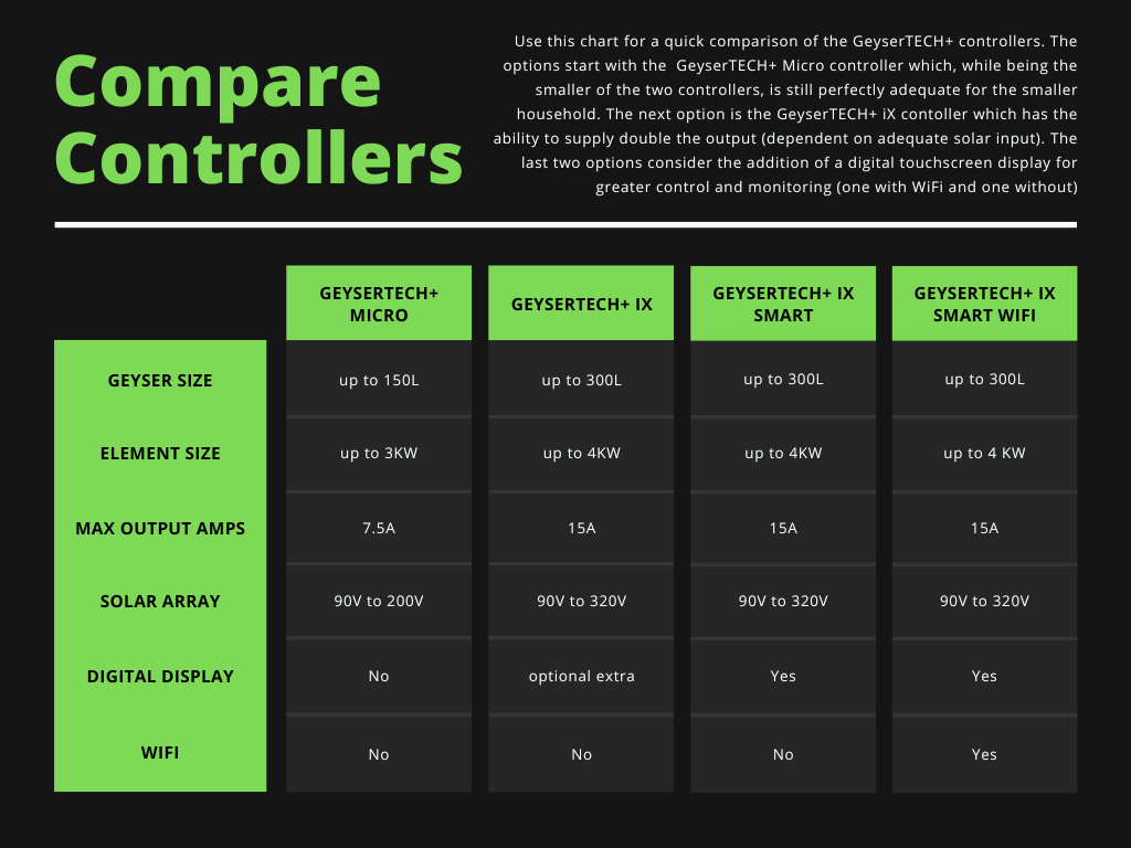 The GeyserTECH+ Pi²R Micro and GeyserTECH+ Pi²R iX GSU’s are both AC and DC connected. This means one can set when grid power should be used to top up the temperature - typically early morning and late evening. This is achieved by means of a timer on the Micro and standard iX and by the programmable touch screen which comes with the iX SMART.